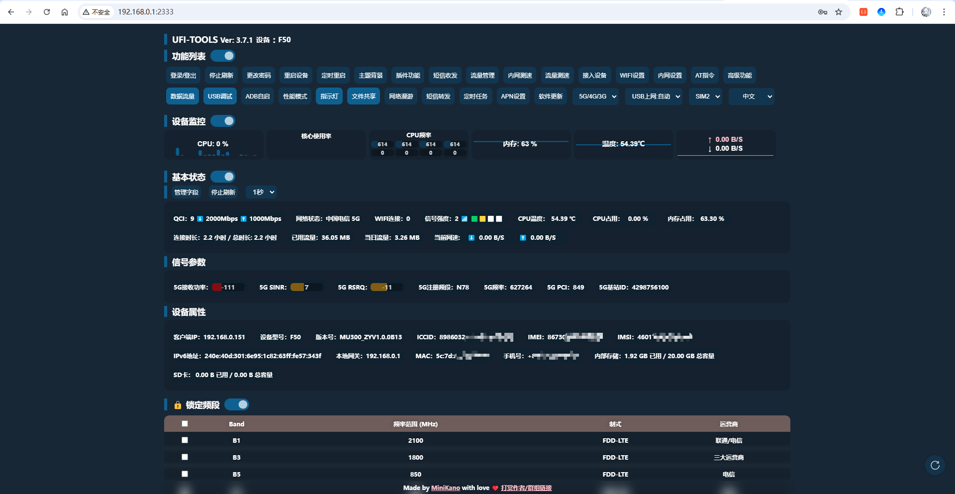 UFI-TOOLS 最绝的是把中兴 F50 的 "隐藏技能" 全解锁了:就像给老手机刷了新系统,不仅能看实时网速、IPv6 地址这些 "体检报告",还能一键开启 USB 调试、网络 ADB,甚至能远程开关文件共享。最实用的是 "锁频段" 功能,好比给 WiFi 装了 "导航系统",直接锁定信号最好的基站,玩游戏再也不跳 ping。