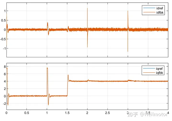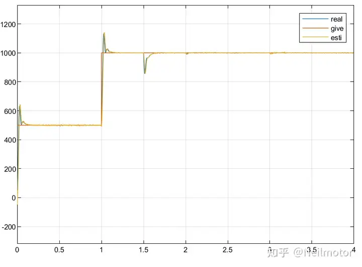 仿真工况:电机空载零速启动,0s阶跃给定转速500rpm,1s阶跃给定转速1000rpm,1.5s实际满载,LESO带宽为8000rad/s。
