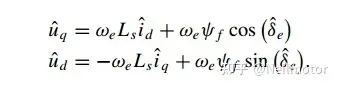 文中的方法可以简单介绍如下,下图所示公式(也是核心公式)为估计坐标系的ud^、uq^,当存在转子位置误差时,uq^无法达到最大值,那么通过传统无感算法估计出的角度之上增加一个较小的角度变量,看Uq是否会变大,如果uq增大了,说明调整方向是对的;如果uq减小了,那么换个方向,减小个较小的角度变量。重复上个过程,最终uq会在最大值附近波动,当然也可以在稳定过程中,减小补偿角度变量的幅值,以求减小波动。但我个人觉得这样会影响动态情况下的响应速度,看个人取舍。由于uq变化幅度较小,辨识起来容易出现误判,这里我对文章的判断方法进行了一些改动。