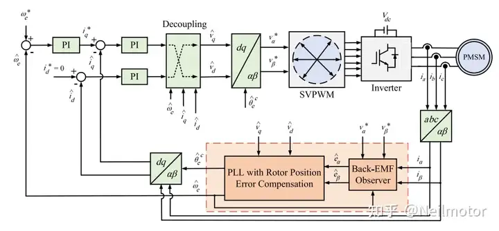 文章基本结构框图如下图所示,这里反电动势观测器我采用LESO,因为LESO自带低通特性必然存在一个转子位置误差,并且可以通过调节增益大小,来改变这个误差。