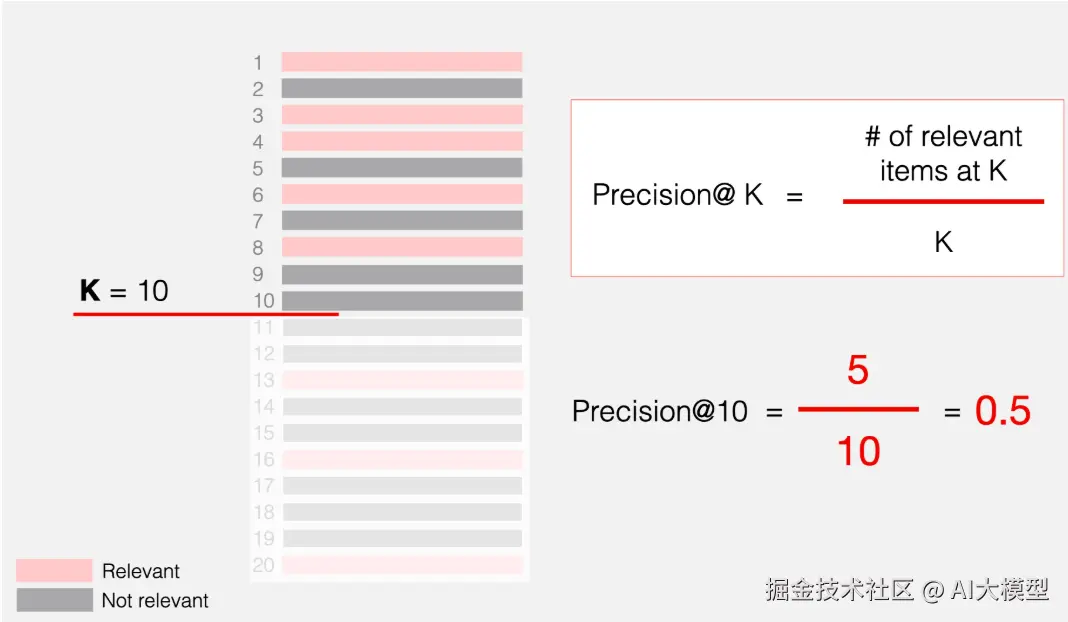 | 精确度@k | 在检索到的前k个结果中,有多少是真正相关的? |
