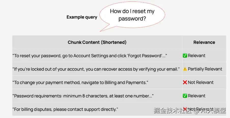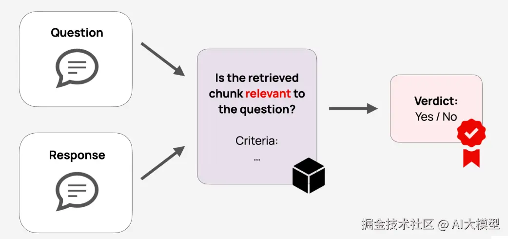 可以把用户的问题和检索到的数据块一起给到LLM评审员,让它来判断信息块和用户问题是否相关。