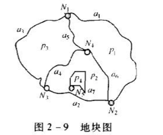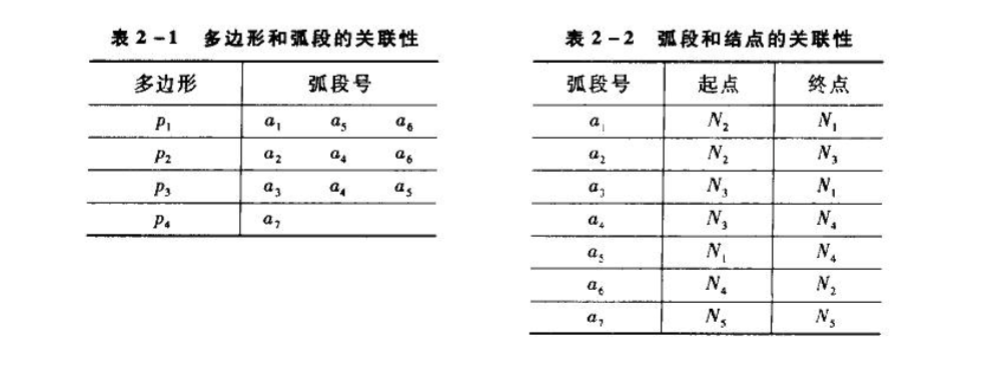 拓扑的关联性表示不同类型元素(结点、弧段、多边形)之间的关系。表2-1和表2-2描述了图2-9地块图的拓扑的关联性。通常,在存储拓扑关系时,拓扑关联性最为重要。