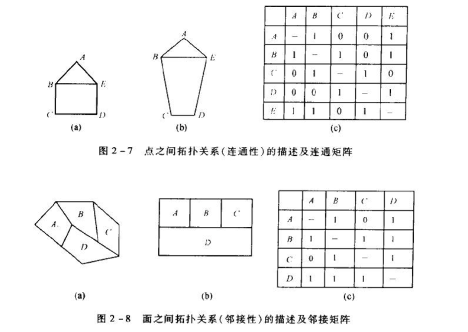 拓扑学中空间基本元素为点、线、面三类,它们之间可归纳为6种关系,关系的性质为关联、相邻、相连、相交、相离、相重、包含等。