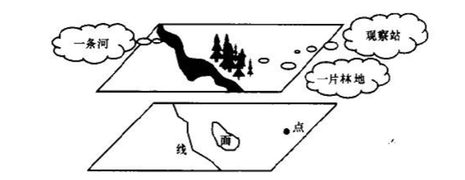 在GIS中,空间数据代表着现实世界地理实体或现象。图2-6为具有一个观察站、一条河和一片林地的区域图及该区域位置形状的矢量数据表达图。其中: