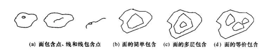 拓扑的包含性主要包括面同点、线、面的包含,指一个点、线或面被另一面包含;也包括点和线被另一线包含。图2-10描述了图素之间的拓扑的包含性。