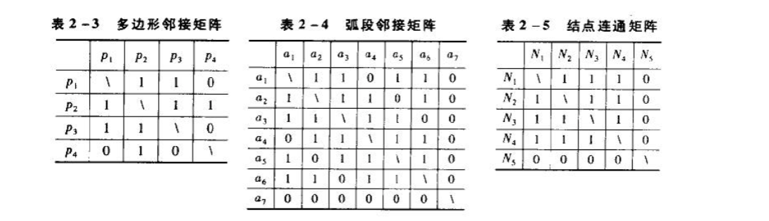 表示同类型元素(结点、弧段、多边形)之间的关系。主要表示多边形之间的邻接性;弧段之间的邻接性;结点之间的连通性。表2-3、表2-4和表2-5分别描述了图2-9地块图的拓扑邻接性和连通性。