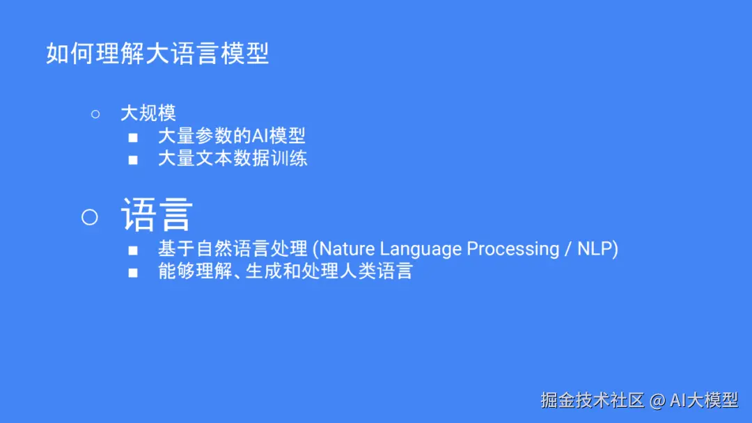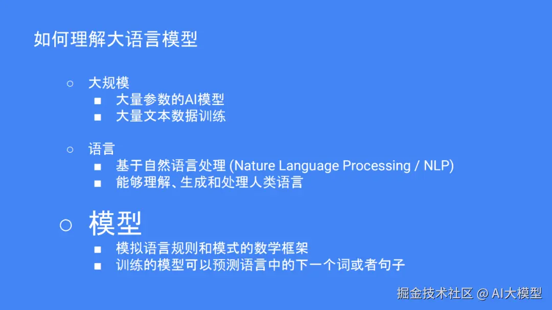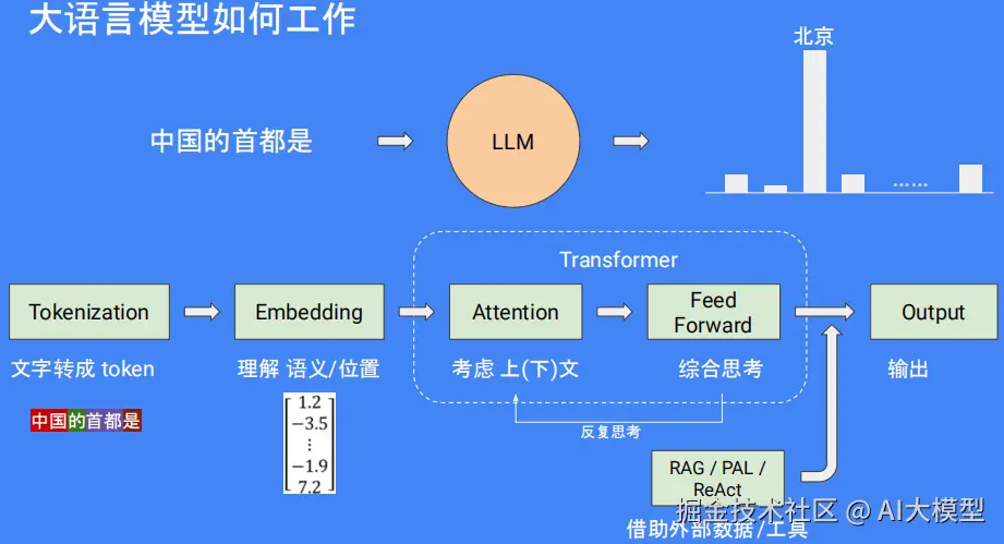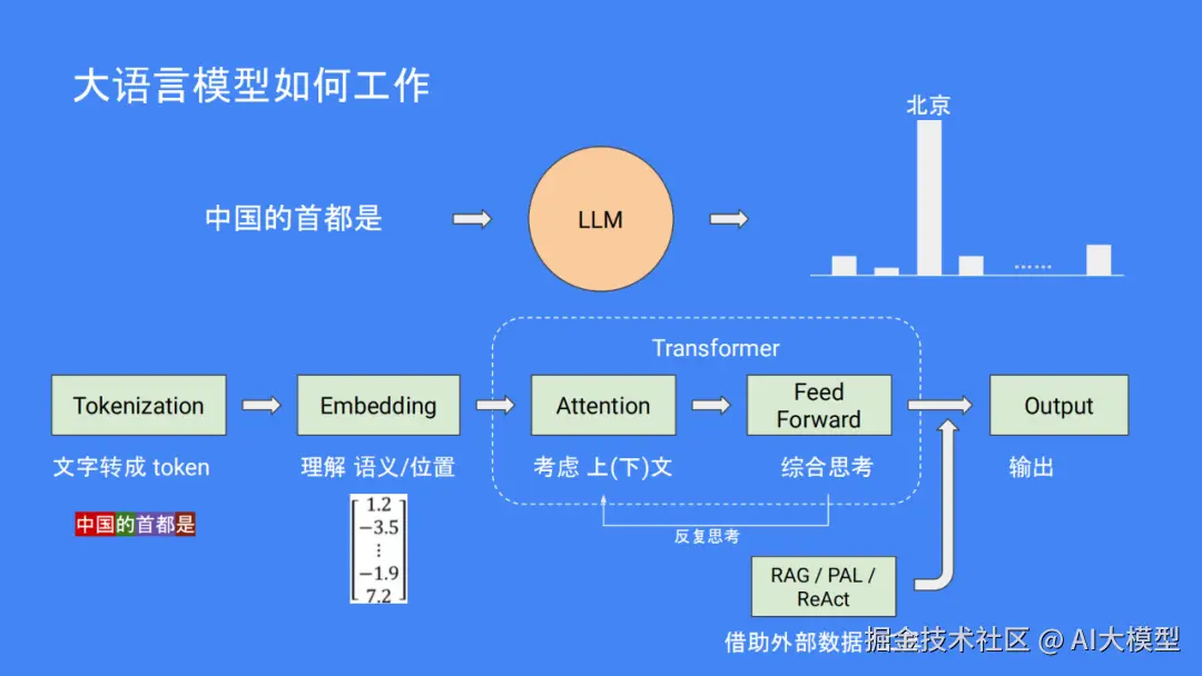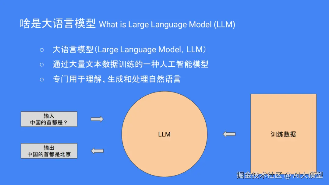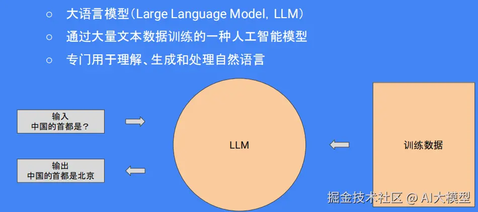 大语言模型(LLM),是一种能够理解并生成我们日常使用的语言的 AI工具。例如,如果你问中国首都的名字是什么?它的核心是通过大量的文本数据来"学"懂语言规则,并且能够预测接下来的单词和句子应该是什么,如"中国首都是北京。"