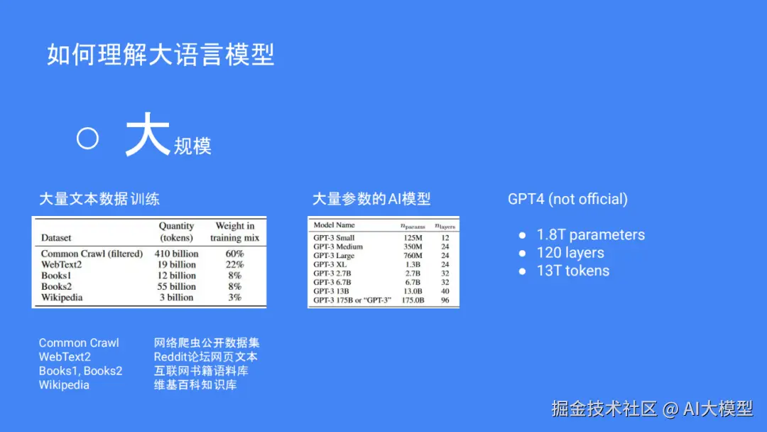 在了解 LLM之前,我们必须了解其"大"之处。一方面,训练数据量很大,主要是使用 Common Crawl网的过滤数据,仅此一项就占据了60%的训练数据,达到4100多亿次;然后是 Reddit论坛的WebText2,Books1和Books2两个在线图书收藏网站,还有维基百科,所有这些加在一起的数据是非常巨大的。另一方面,模型的参数较多,如GPT-3,参数最小为1250万,参数最大为1750亿,共96层;非官方的消息称GPT-4更加夸张,其参数多到1.8兆字节,120个层次,并且学习了13兆个单词。而且,由于是基于自然语言处理的方法,所以非常符合人的语言逻辑。