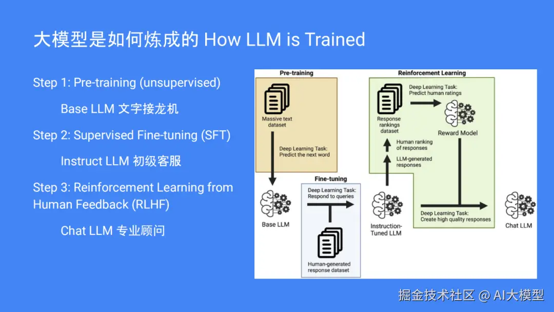 训练LLM有3个步骤。第一阶段是非监督式的预训练阶段,将大量的文本输入到模型中,先进行"文字接龙"的练习,其核心是猜测接下来的单词;第二步就是进行有监控的微调,训练机器人使用人工编写的答案来准确地回答用户的提问,就像一个初级客户服务人员一样;第三步就是通过人的反馈进行强化学习,按照人们对模型的响应等级来训练激励模型,最终将该模型完善为一名专业的咨询师。