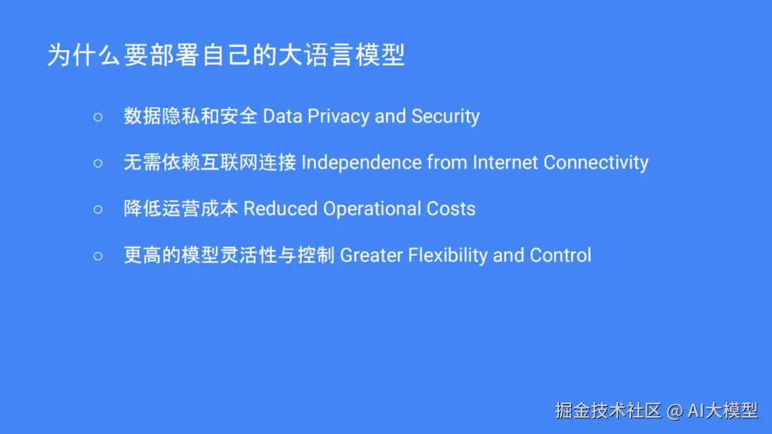 如果你想尝试自己部署,可以使用谷歌标签。Llama3.1是 Meta在去年的4个月开放的一个模型,虽然95%的训练数据都是用英文的,但是 Llama3.1有很多版本。再使用开放源码的 LLM开发平台 Ollama,流程也不是很复杂,打开 Colab,选择 GPU支持的环境、安装 Ollama、下载 Llama3.1、运行 Lllama3.1,然后就可以和模型进行交互。如果硬件不够好,也可以尝试在本地部署或与 ngrok一起进行远程接入。