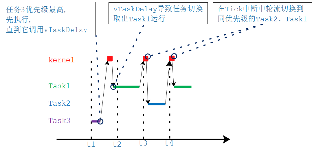 - 任务3优先执行,直到它调用vTaskDelay主动放弃运行
