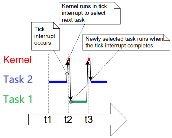 - 两次中断之间的时间被称为时间片(time slice、tick period)