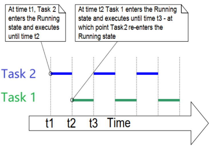 对于同优先级的任务,它们"轮流"执行。怎么轮流?你执行一会,我执行一会。