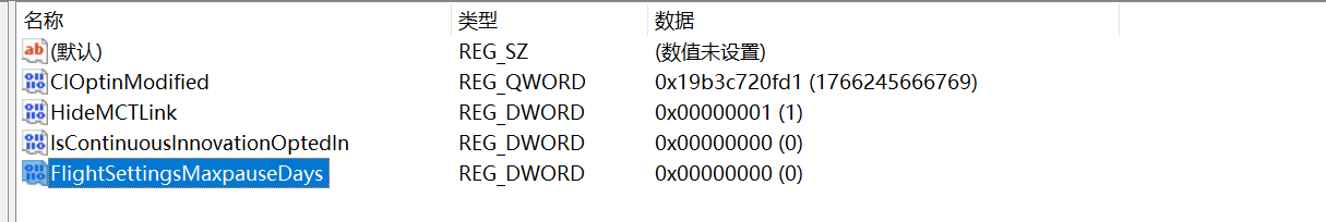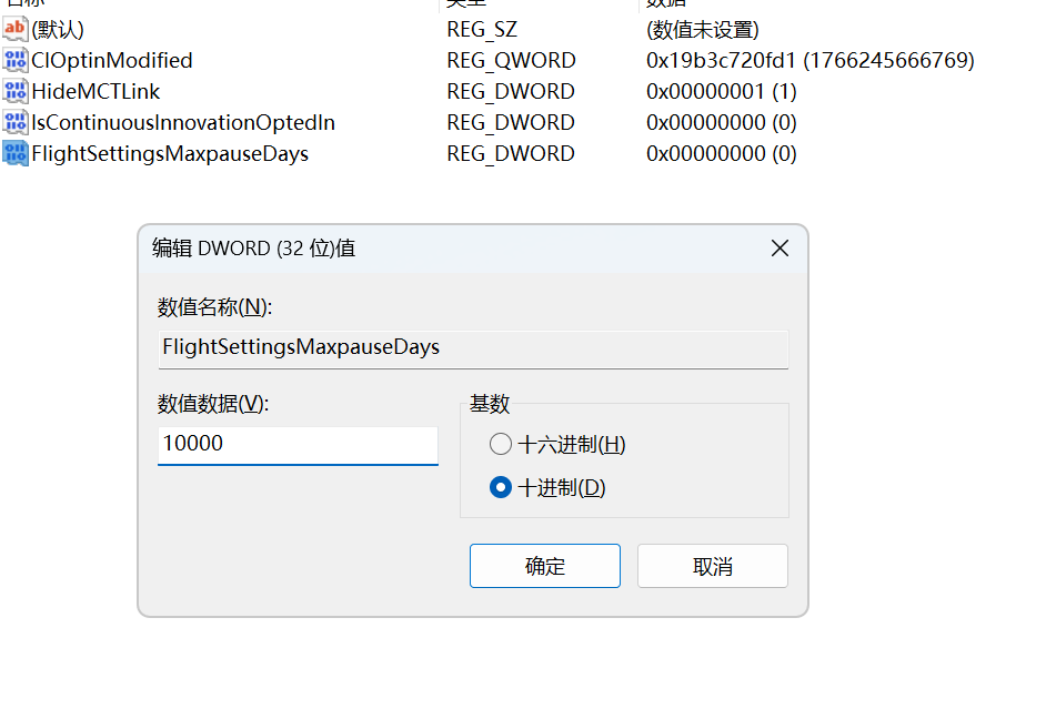 3、在空白处新建一个DOWORD值,然后把他重命名为 FlightSettingsMaxpauseDays 然后双击打开 选择十进制 数值输入10000 点确定