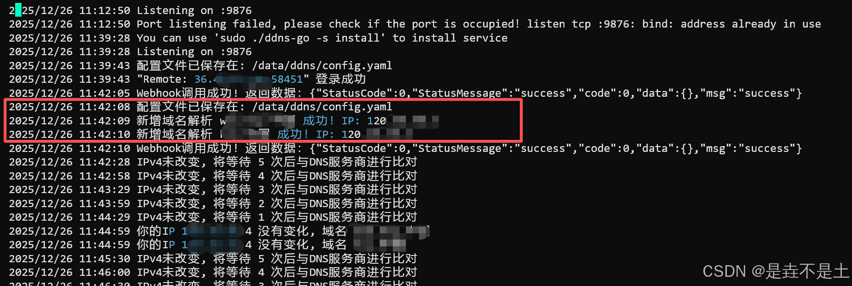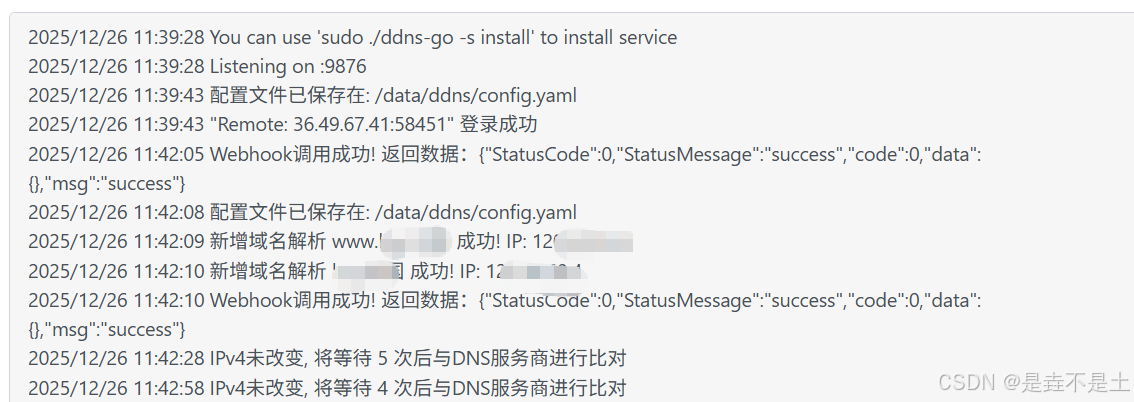 command=sudo /data/ddns/ddns-go -f 30 -l :9876 -c /data/ddns/config.yaml,使用这个的原因在于配置文件可以存放在我们自己想存放的地方,不然的话默认是~/.ddns_go_config.yaml,修改和查看起来对一些朋友们不是特别友好,但是要注意这个文件尽量不要让别人看到。第二点,-f 30参数,这是我自己配置的,实现每 30 秒检测一次 IP 变化,因为这个项目后续要迁上我们公司去使用,所以需要较高的准确性和响应,所以做了每30秒检测一次,当然后续有可能调整的更低。