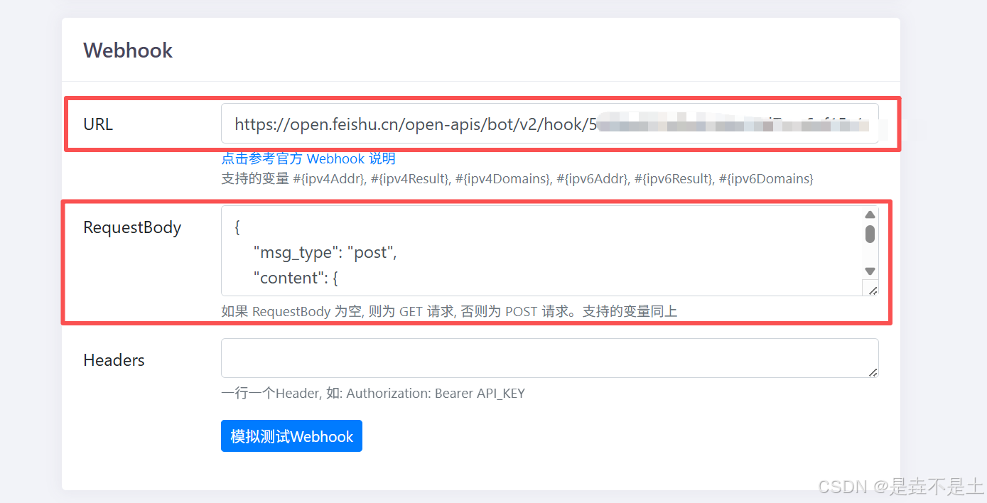 webhook字段就看个人的意愿了,URL部分填写飞书的机器人URL,相应结构部分写如下参数: