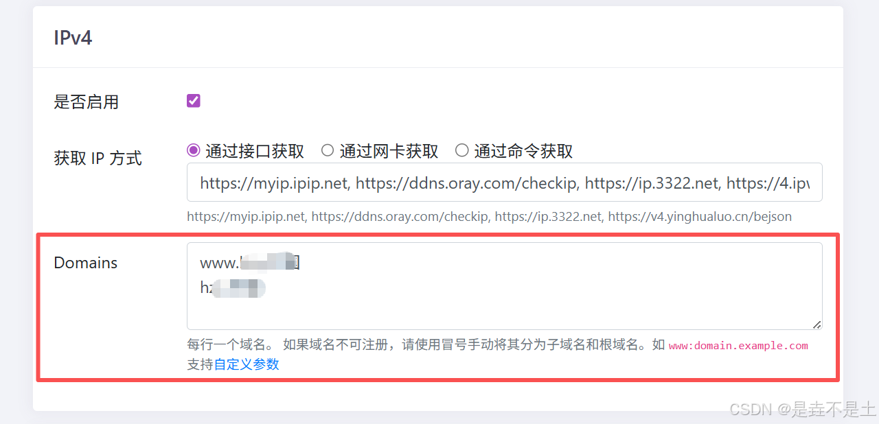 我们就选择启用、通过接口获取IP即可。Domains选择你想用的域名 。 当然在这个之前不需要你自己去阿里云新建解析了,因为有了令牌,在我们这里的配置保存后,它直接自动给我们创建好新的A记录了。