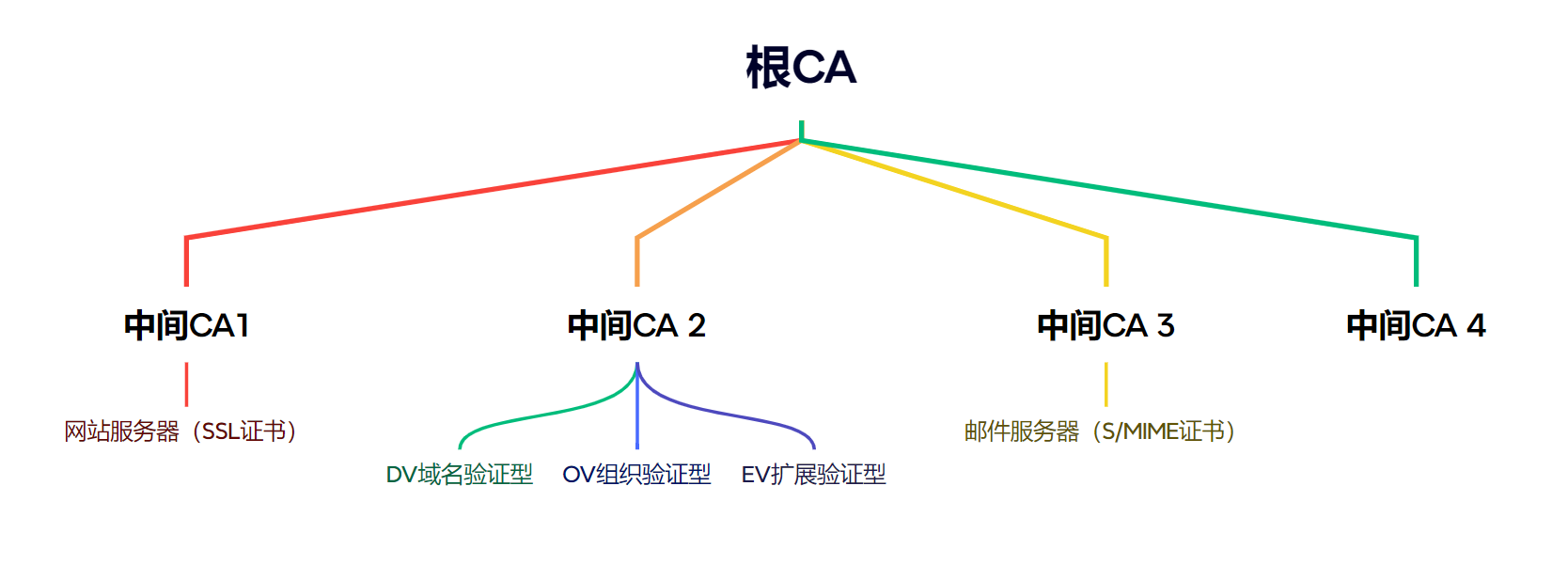 CA 是分层级的,层级结构为树状层级,主要分为根 CA、中间 CA 和终端实体