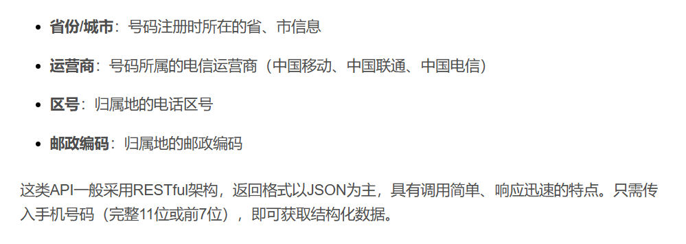 手机归属地查询API通常支持全国三大运营商(移动、联通、电信)的号码查询,返回结果包含以下核心信息: