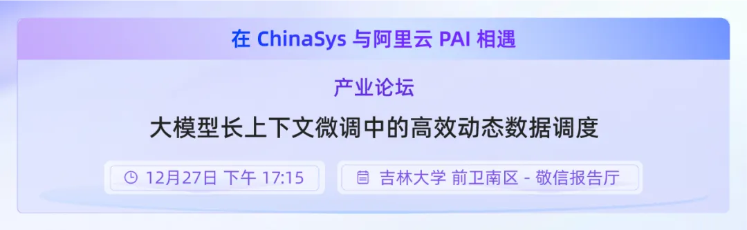 阿里云大数据 AI 团队将深度参与ChinaSys 2025。PAI 团队将在 ChinaSys 2025 带来演讲,与参会者分享大模型长上下文微调中的高效动态数据调度方案 Skrull。 同时将在阿里云展台为大家揭秘 Qwen3 训练端到端加速比提效 3 倍 的核心技术、分享阿里云大数据 AI 平台的最新研究成果和技术思考,更有核心研发团队面对面交流的机会!