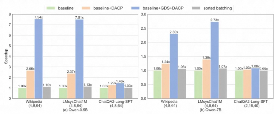 实测表明,Skrull 相比基线平均提速 3.76 倍,最高达 7.54 倍,为高效长上下文训练提供了实用的系统优化思路, 充分验证了 Skrull 在长上下文微调中的性能与价值**。**