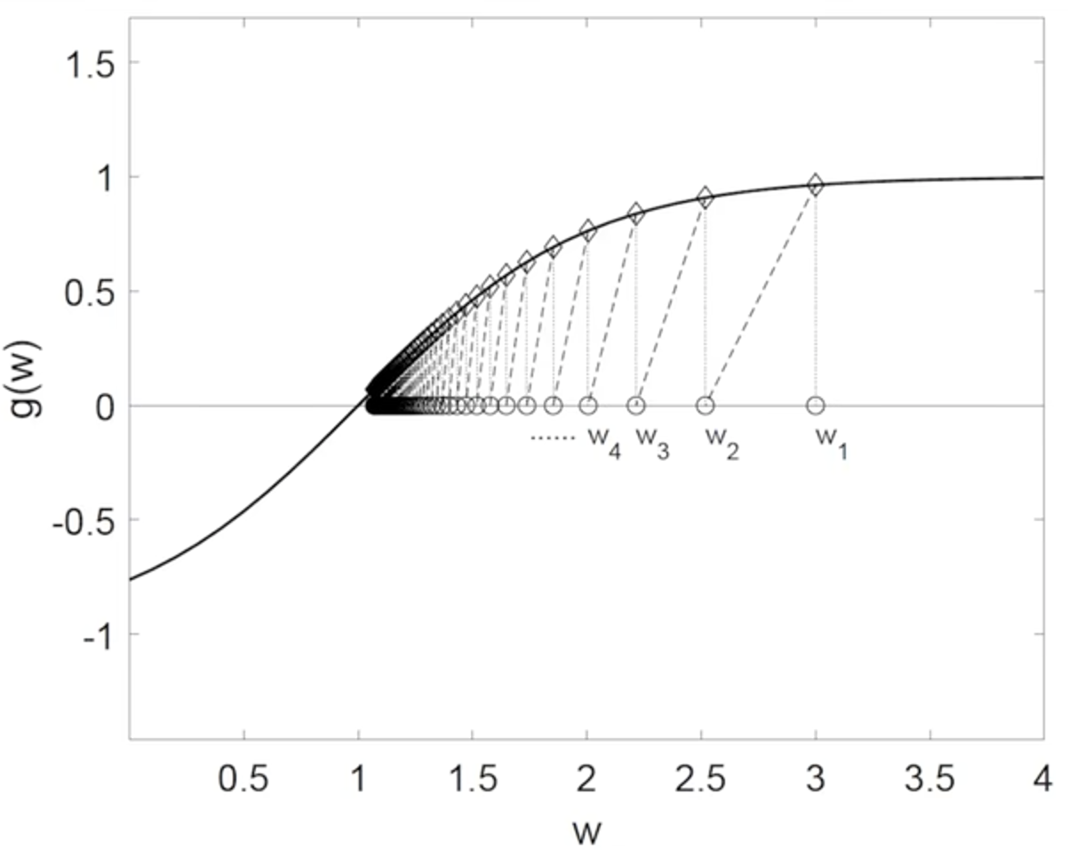 当 ω k < ω ∗ \omega_k<\omega^* ωk<ω∗, g ( ω ) < 0 g(\omega) < 0 g(ω)<0, − α k g ( ω k ) -\alpha_k g(\omega_k) −αkg(ωk) 将令 ω k + 1 \omega_{k+1} ωk+1 增大;