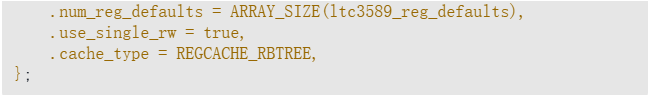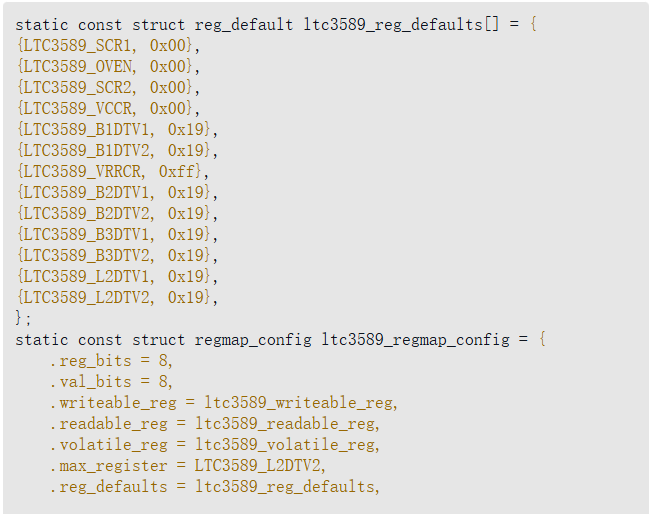 其中,reg是寄存器地址,def是寄存器的默认值。如果cache_type字段设置为none,reg_default元素将被忽略。如果未设置reg_default元素但仍启用缓存,则创建相应的缓存结构。它非常简单易用,只需要声明它并将它作为参数传递给regmap_config即可。让我们看一下位于drivers/regulator/ltc3589.c中的LTC3589稳压器驱动程序: