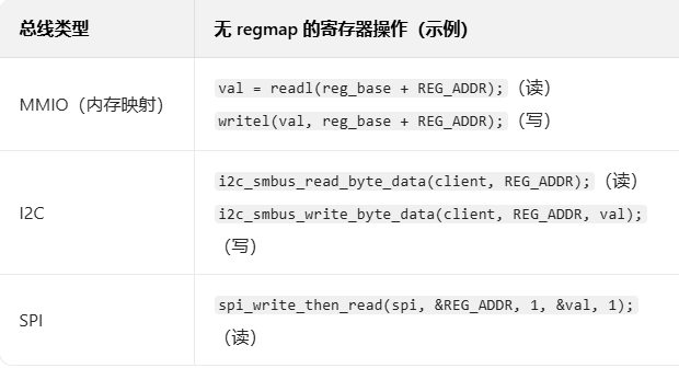 在Regmap API被开发出来之前,处理SPI、I2C或内存映射设备的设备驱动程序中存在冗余代码。许多设备驱动程序包含的用于访问硬件设备寄存器的代码非常相似。