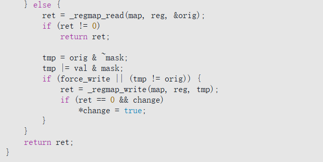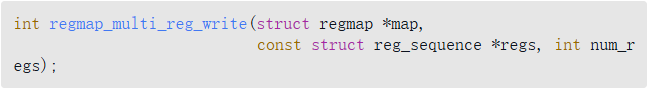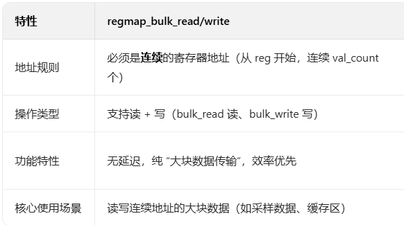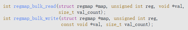 其中,map是要操作的寄存器映射,reg表示读/写操作必须从哪个寄存器地址开始。在读取的情况下,val将包含读取的值;在写入的情况下,val必须指向要写入设备的数据数组。最后,val_count是val中的元素数量。