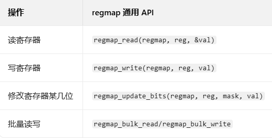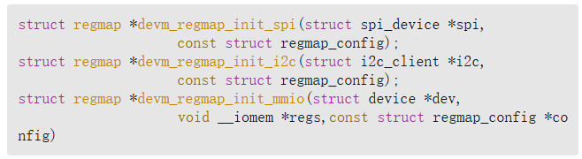 · 在探测函数中,使用devm_regmap_init_i2c()、devm_regmap_init_spi()或devm_ regmap_init_mmio(),分别根据与底层设备连接的方式------I2C、SPI或内存映射------分配一个寄存器映射。