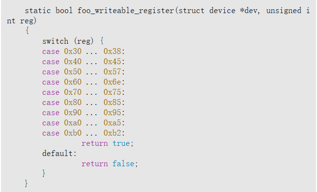 你可以提供一个regmap_access_table对象,而不是提供writeable_reg回调函数。regmap_access_table对象是一个包含yes_ranges和no_ranges字段的结构体实例,这两个字段都是指向regmap_range对象的指针。属于yes_ranges条目的任何寄存器都将视为可写,而属于no_ranges条目的寄存器则视为不可写。