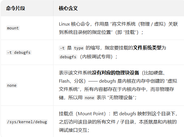 从用户空间可以通过debugfs文件系统监视寄存器映射。为此,首先需要通过CONFIG_DEBUG_FS内核配置选项启用debugfs,然后使用以下命令挂载debugfs:
