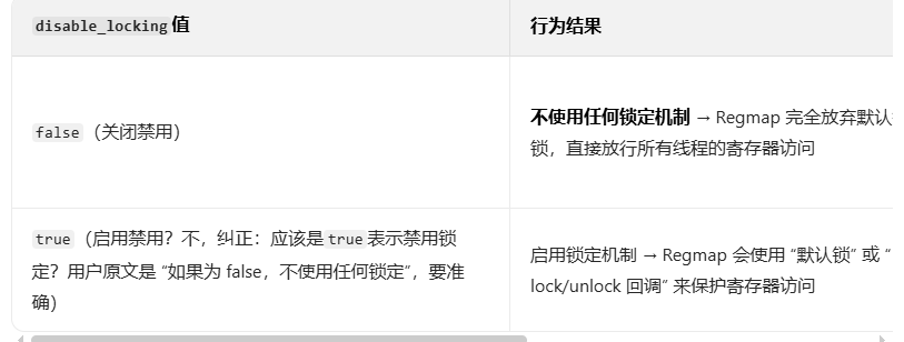 用于指明是否应该使用锁定/解锁回调函数。如果这个布尔字段为false,则意味着不使用任何锁定机制。Regmap对象要么通过外部手段受到保护,要么保证不被从多个线程访问。