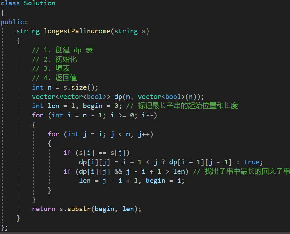 if (dp[i][j] && j - i + 1 > len) // 找出⼦串中最⻓的回⽂⼦串