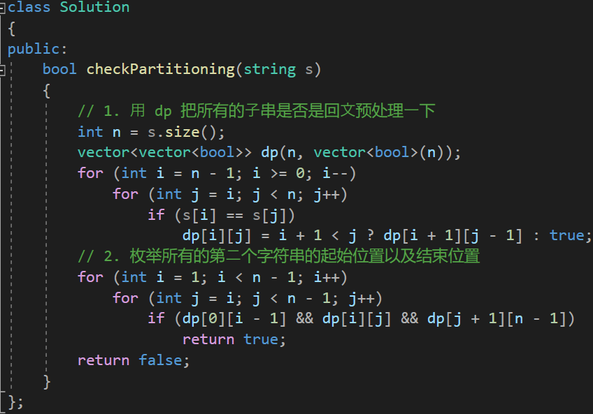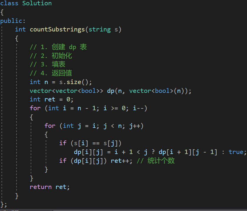 vector<vector<bool>> isPal(n, vector<bool>(n)); // 统计所有⼦串是否是回⽂串