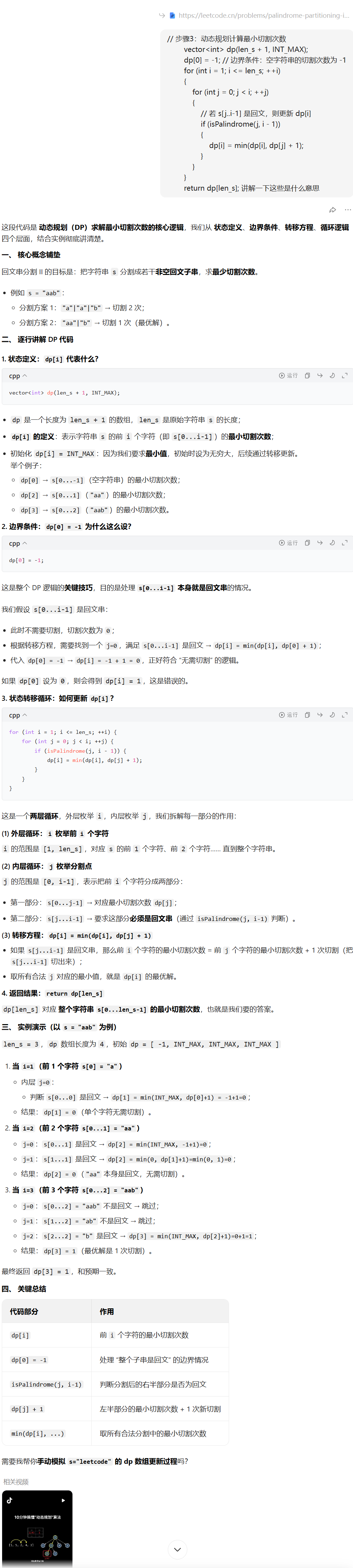 dp[0] = -1; // 边界条件:空字符串的切割次数为 -1