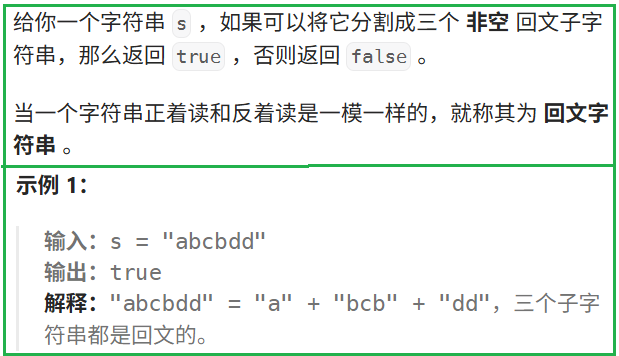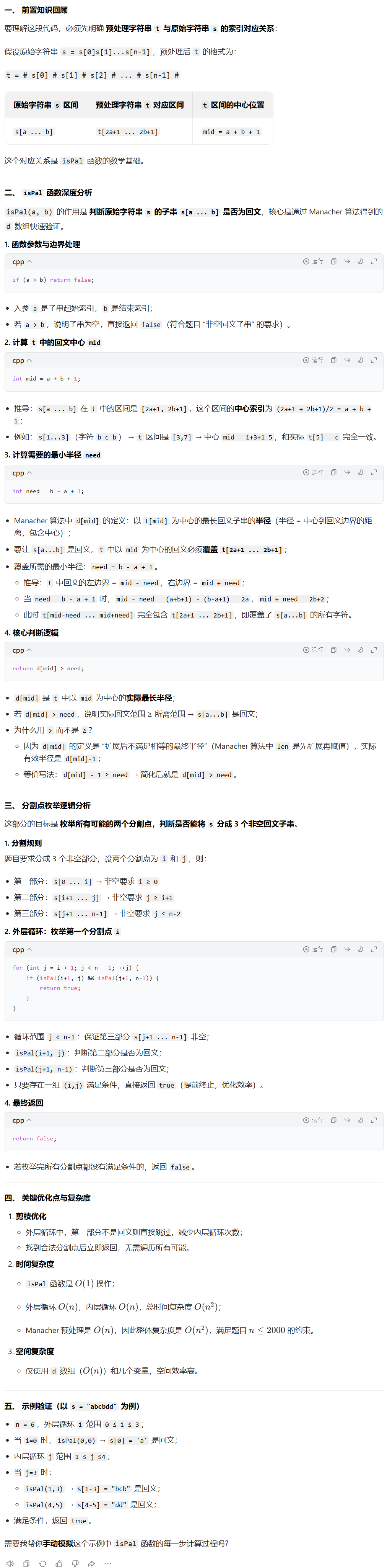 // 步骤4:枚举分割点(分成 3 个非空回文子串)