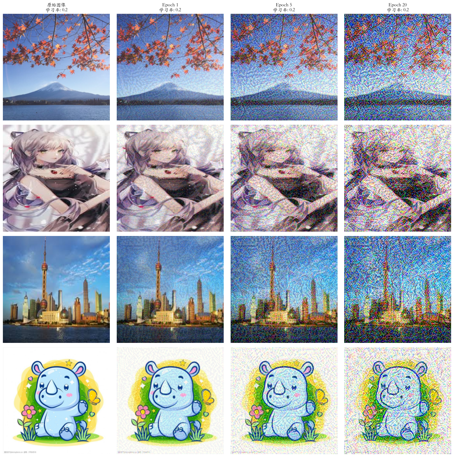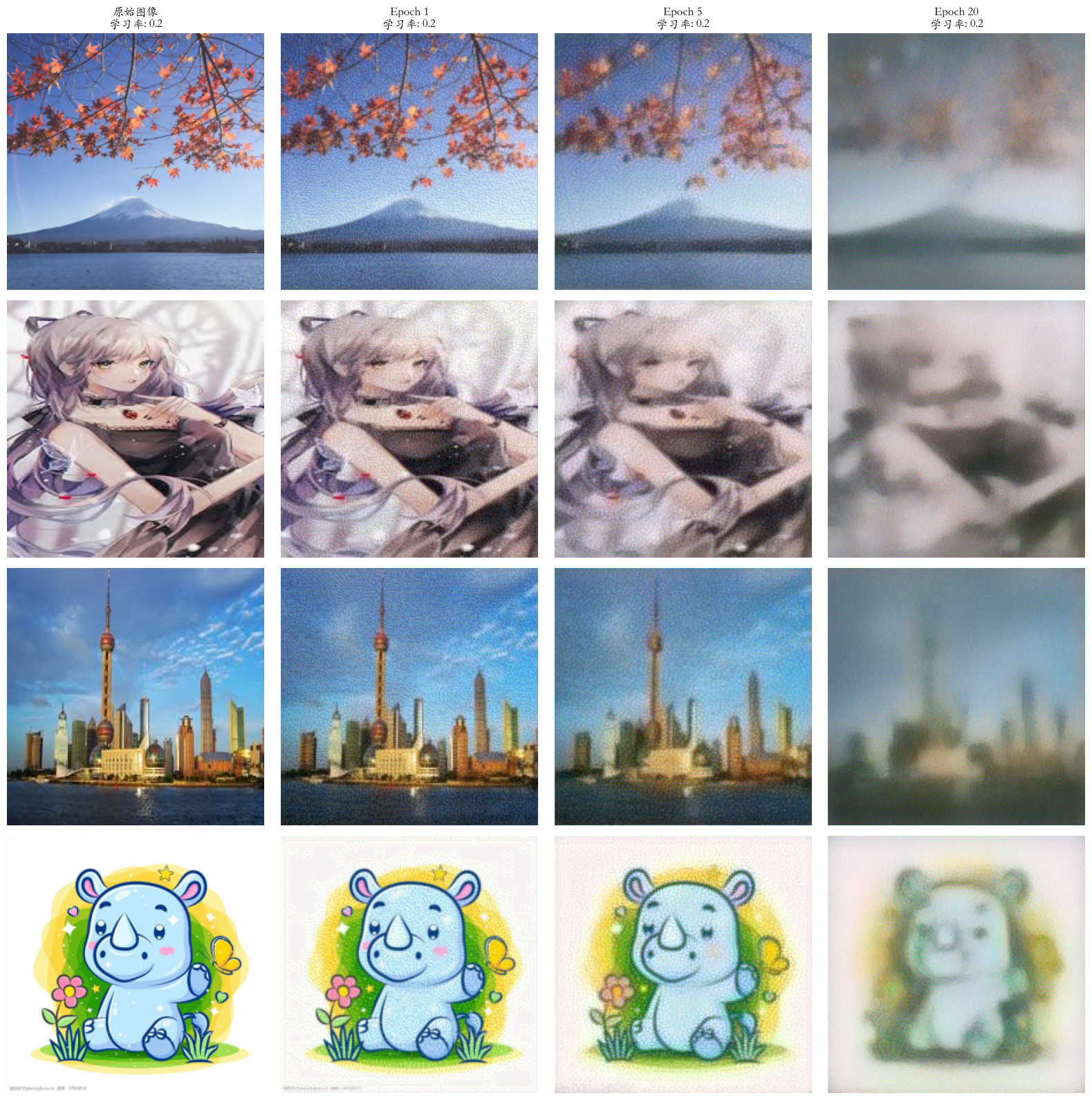 titles = ['原始图像'] + [f'Epoch {epoch}' for epoch in target_epochs]