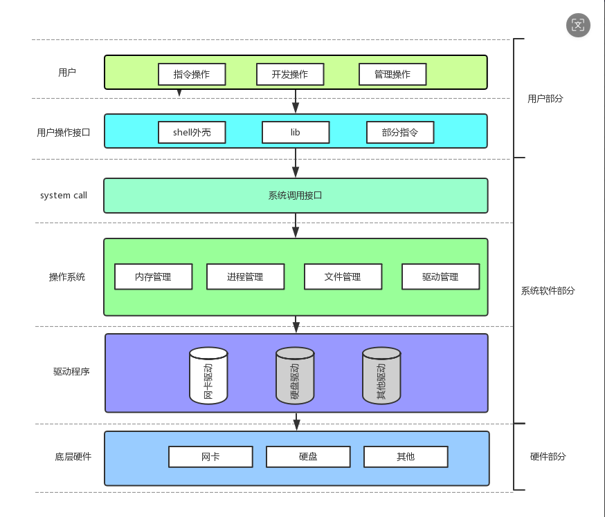 根据这张图知道,操作系统是管理下面的软硬件资源,通过管理这些资源才能为用户提供一个良好的运行环境。
