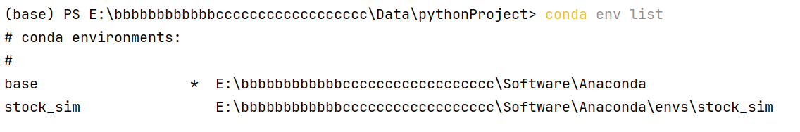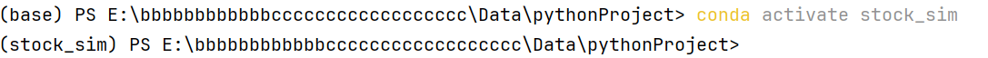 打开终端(Windows 用户请使用 Anaconda Prompt ,pycharm如果添加了系统环境变量,也可以使用pycharm的终端),stock_sim 为环境名字 ,输入: