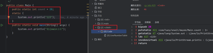 这个阶段就开始真正执行代码了,编译器在编译的时候会自动生成一个<clinit>方法(如果有类静态变量或者静态块),这个方法里搜集了类里面所有类变量的赋值操作和静态块里面的语句。然后按照他们在源码里出现的顺序,拼接在这个方法里。