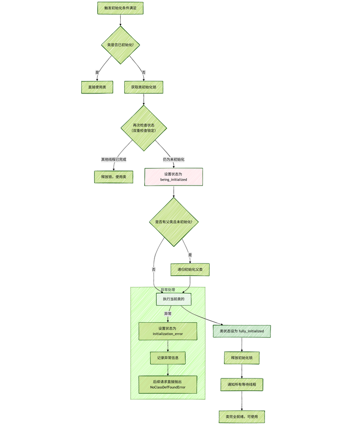 在被触发初始化时,JVM必须保证这个类已经完成了加载、验证、准备,至于解析,初始化过程需要用到的符号引用也需要解析,其他没用到的可以延迟到首次使用的时候进行解析。如果初始化触发了,类还没加载,就会去触发类的加载过程,顺序的执行下来,保证类的初始化。