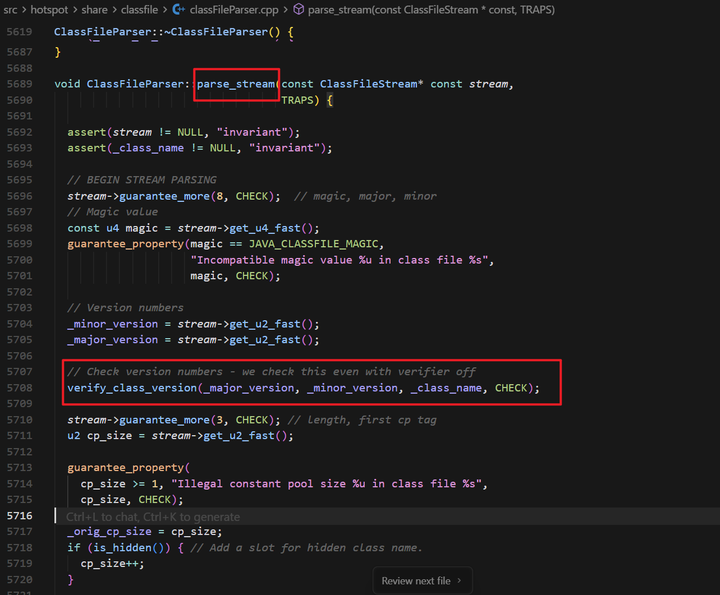 最直观的就是HotSpot实现中的classFileParser在解析字节码流的时候,已经在做魔数、版本号等格式合法性检查。其实文件头、常量池、字段/方法表等的校验也穿插在了Loading阶段,只是逻辑上属于Linking的验证阶段。