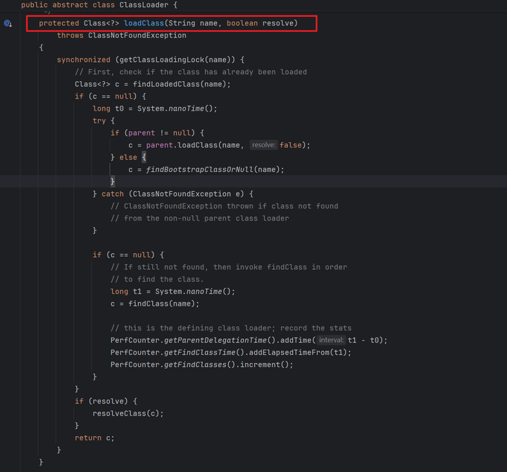接下来我们看一下双亲委派,这个机制的核心逻辑都在ClassLoader的loadClass里面。