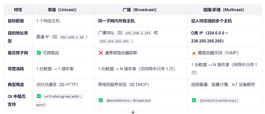 QUdpSocket(继承自 QAbstractSocket),面向无连接,支持单播、广播、多播