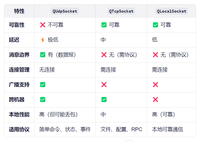 与 QTcpSocket 不同:QUdpSocket 没有"连接"概念,同一个 socket 可向多个目标发包,也可接收来自任意源的数据。
