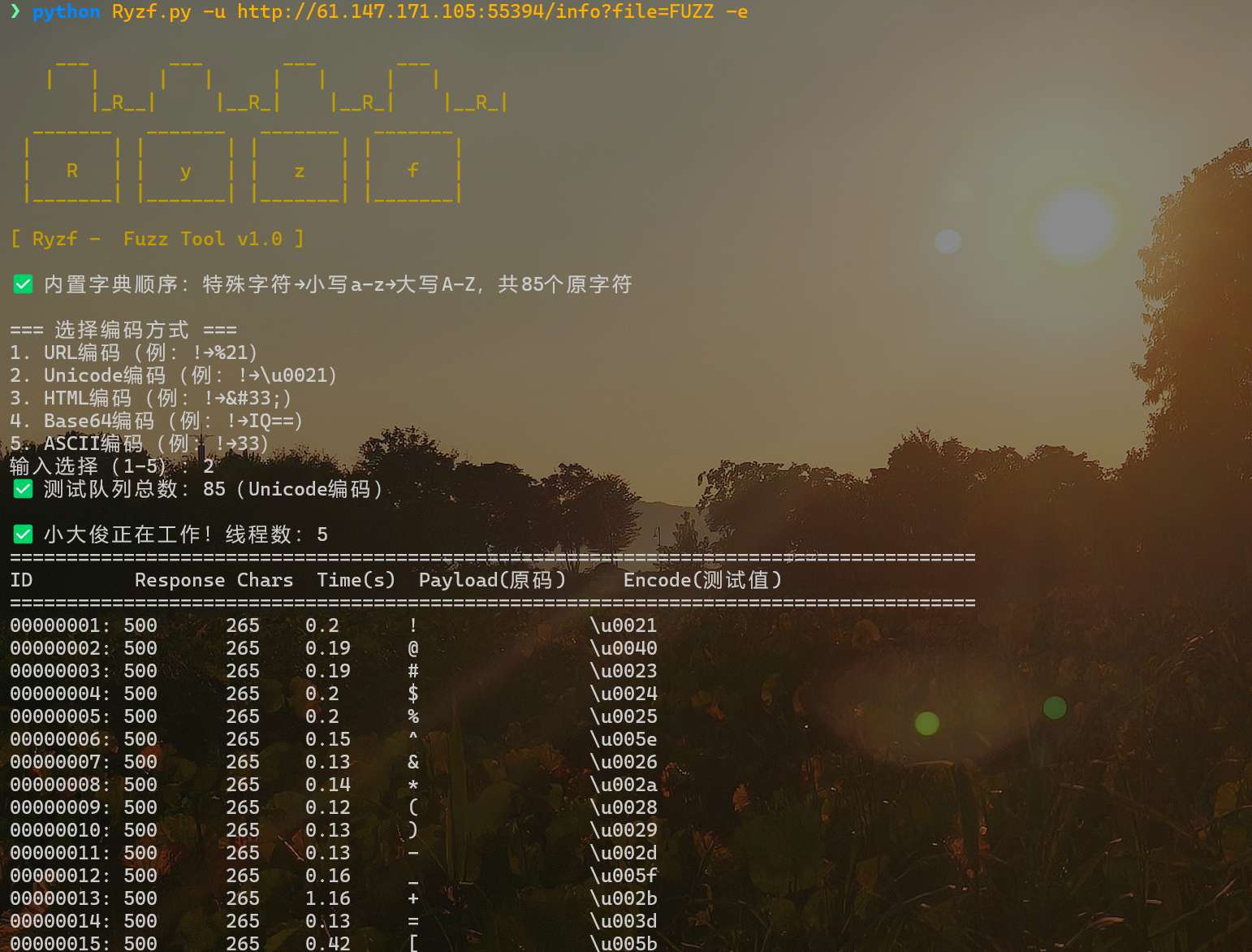 一款轻量级的CTF/渗透测试Fuzz工具,专为URL/输入框的字符模糊测试设计,支持多编码方式、多线程、代理转发等功能,适配CTF竞赛和渗透测试中的字符注入检测场景。