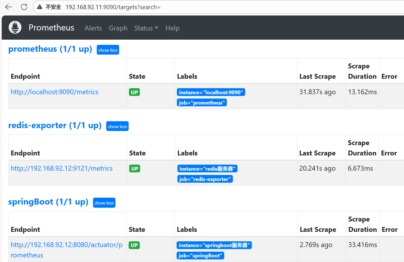刷新访问http://192.168.92.11:9090/targets?search=、确认新监控的springboot服务器是否生效