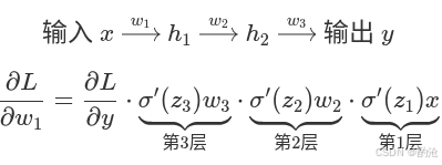 根据链式法则 ,梯度是从后往前传递的连乘积。梯度的表达式是一串形如 (w⋅σ′)(w \cdot \sigma')(w⋅σ′) 的因子乘积。